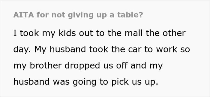 For this redditor, time at the mall with her two little children was seemingly going great, until they decided to unwind and kill some time at the food court. That’s where they were approached by a lady and her mother, asking the OP to give up her table. Little did they know, the woman was not planning on moving.