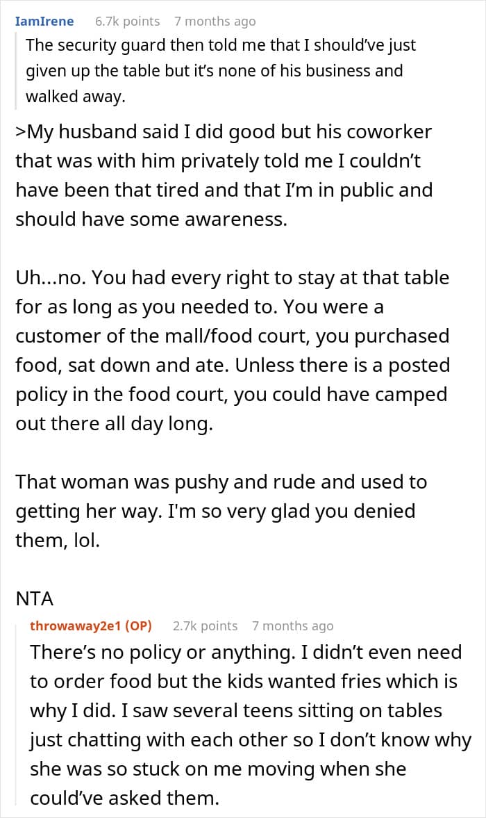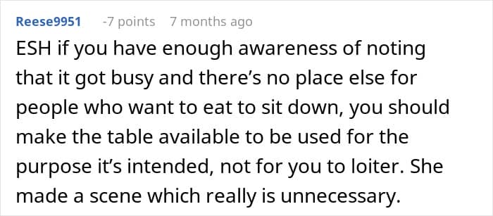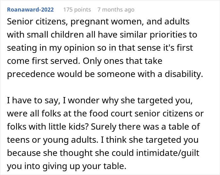 Another group that could typically use a moment to sit down and unwind more than regular folk is the elderly, who often don’t have as much energy as a teenager, or an adult, for that matter, would. That’s why quite a few netizens believed the OP should have given up her table for the woman who approached her with her mother. Others, though, said that she shouldn’t have, since said couple of women weren’t seemingly eating anything, and the arguments didn’t stop there. Both camps shared their opinions in the comments under the redditor’s post.