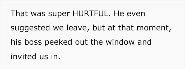The woman recalls that it was incredibly hurtful to hear, but her husband seemed to be thinking only about the impression they would make on the boss and his partner. He even offered to leave – but at that moment the boss leaned out of the window and called them inside.