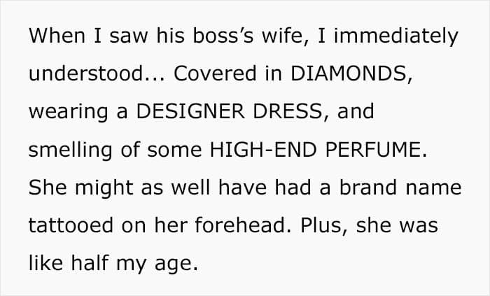 Yes, the boss’s wife, as the OP herself says, really did look gorgeous: in a designer dress, covered in diamonds, and smelling of some high-end perfume. And, what’s also important, she appeared to be about half of the author’s age.