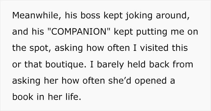 The dinner didn’t go well – the OP’s husband was clearly out of his element, and didn’t crack jokes left and right, as usual. In turn, the boss was in a good mood, and his wife constantly asked how often the author visited this or that boutique. The OP admits that she had a hard time restraining herself from asking the other woman if she had ever opened a book in her entire life.