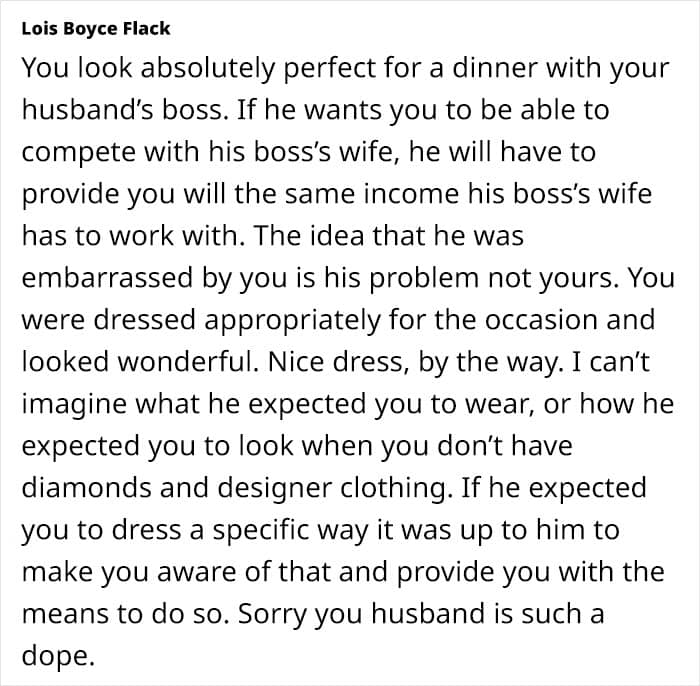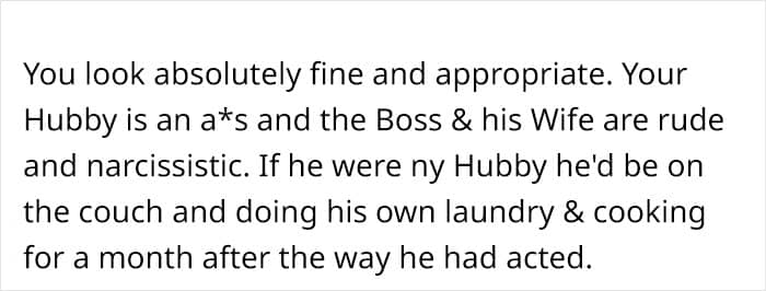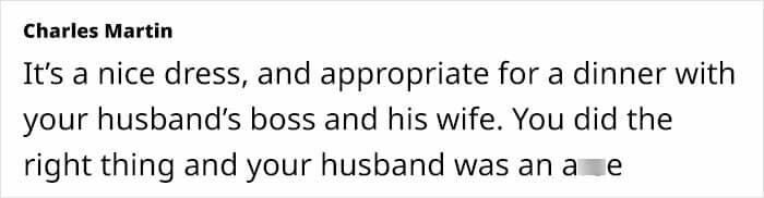 According to people in the comments, the OP’s outfit looks really nice. “You look absolutely perfect for a dinner with your husband’s boss. If he wants you to be able to compete with his boss’s wife, he will have to provide you will the same income his boss’s wife has to work with,” another person concluded wisely. And what do you, our dear readers, think about this situation?