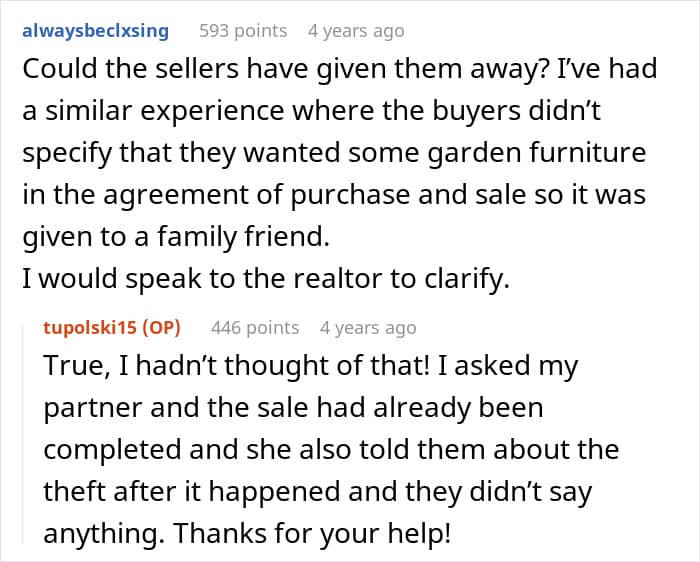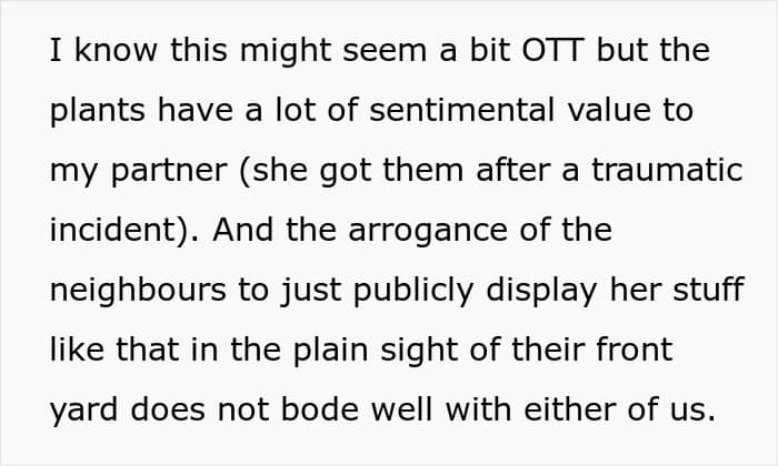 For redditor Tupolski15’s partner, her plants held a lot of sentimental value, as she got them following a traumatic experience. However, after she moved with them to a new house, they were stolen. It turns out that it was her neighbors who were ‘friendly’ welcoming her into the neighborhood.