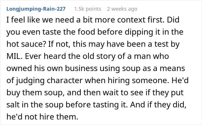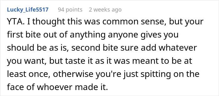 Opinions of commenters under the original post were very divided. Some people really think that the MIL gave the author a kind of psychological test, while others believe that it was disrespectful to the cook to dip the first piece of lasagna into the sauce without trying its real taste. And whose side do you, our dear readers, lean toward more?