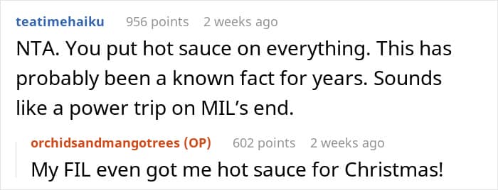 So, the Original Poster (OP) is 20 years old, and she, in her own words, loves her husband and hot sauce very much. Moreover, she loves the sauce to such an extent that she adds it to literally all dishes. Recently, their mother-in-law came to visit them, volunteering to treat her son and daughter-in-law with something tasty. For example, lasagna.