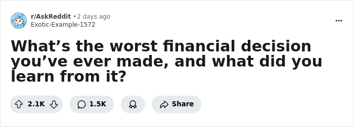 That’s not to say that any money-related blunders you make don’t hurt in the moment… they do. A lot! Recently, some AskReddit members opened up about the very worst financial decisions they’ve ever made. Scroll down for their stories, as well as the tough lessons they learned.