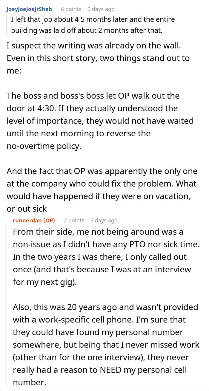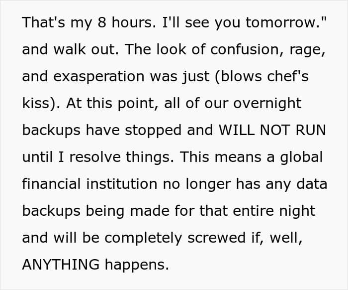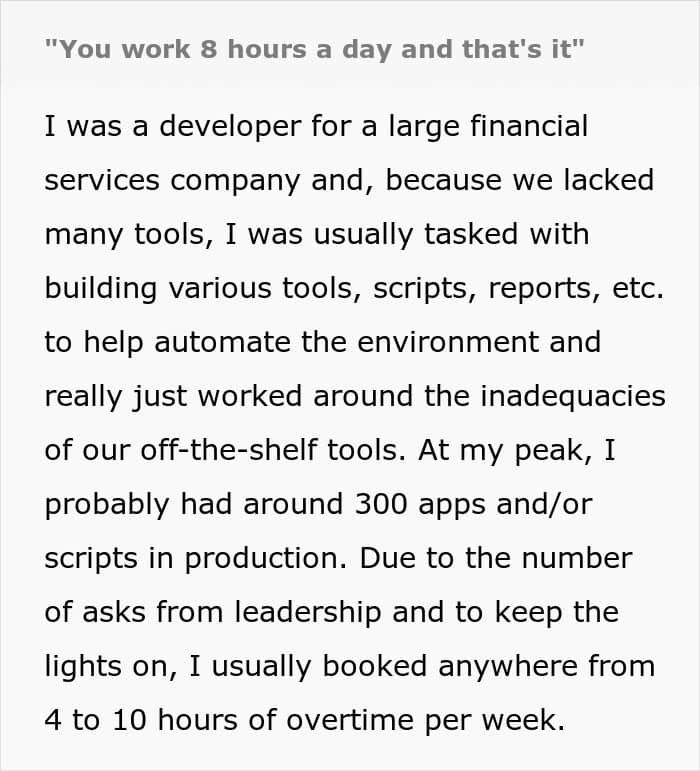 Working long hours isn’t anyone’s favorite, but for one Redditor, it was necessary to keep a large financial company running smoothly. As a dedicated developer, he often stayed late to make sure any issues were taken care of. However, things took a turn when a new boss came in and enforced a strict “no overtime” rule.