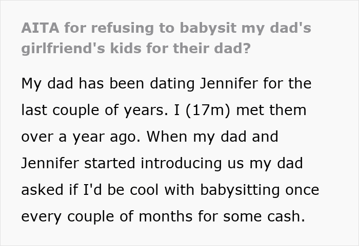 The teen’s dad’s girlfriend asks the 17-year-old to babysit her 3 kids and pays him well, so he regularly helps her out by watching her kids