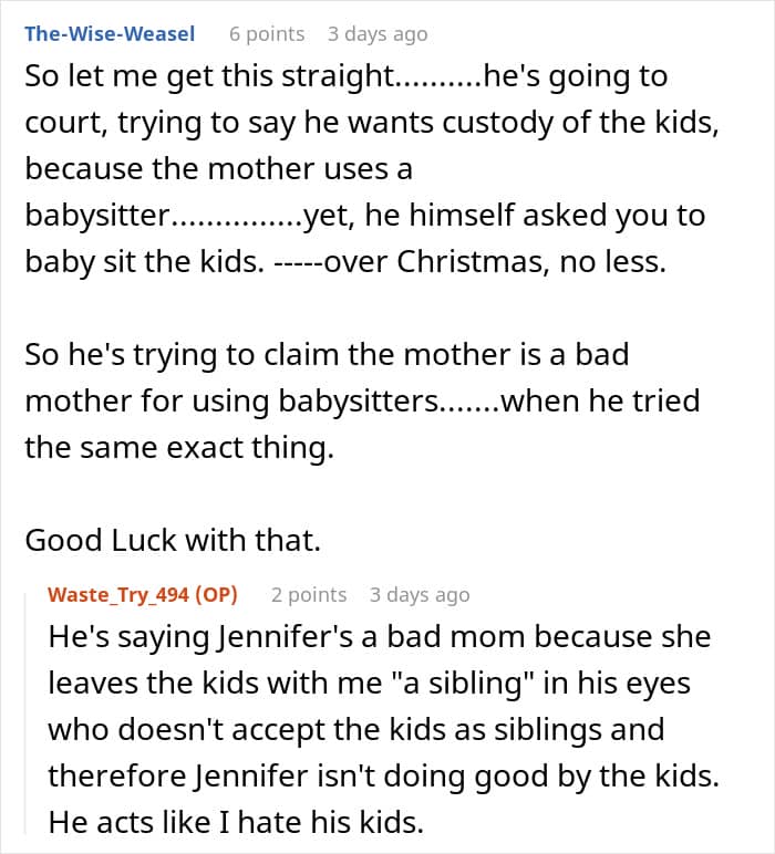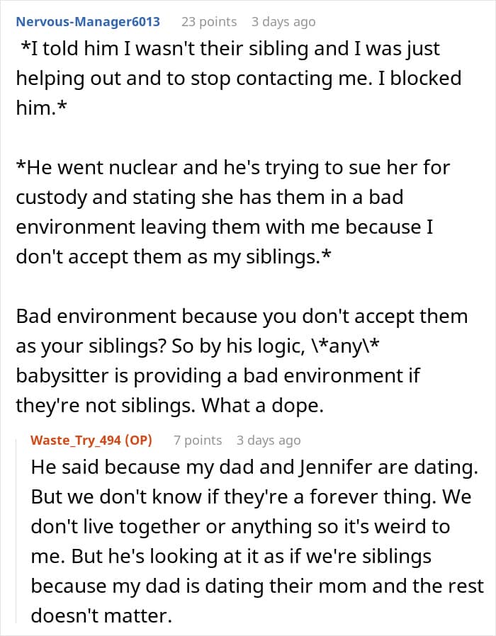 When the OP blocked him, the ex doubled down, using the teen’s refusal as some twisted evidence in a custody battle. His claim? That Jennifer’s home environment was unsuitable because her boyfriend’s son wouldn’t babysit his kids. Yeah, let that logic marinate for a sec.