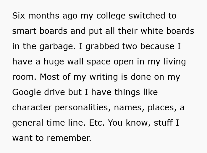 However, one day, she arrived home to find that everything on her whiteboards had been wiped off completely. Surprisingly, her boyfriend had wiped it all off because, according to him, he felt she was too focused on writing and didn’t have time for him. This came as a surprise to her because he’d never mentioned it before.