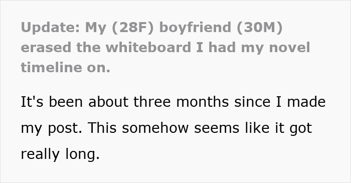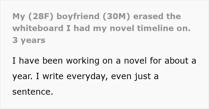 Today’s Original Poster (OP) had been working on a novel for a while, but when her boyfriend wiped her notes completely off the board because she didn’t have enough time for him, she started to question their relationship.