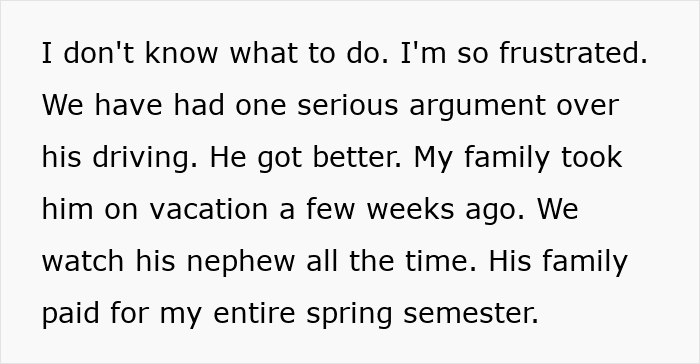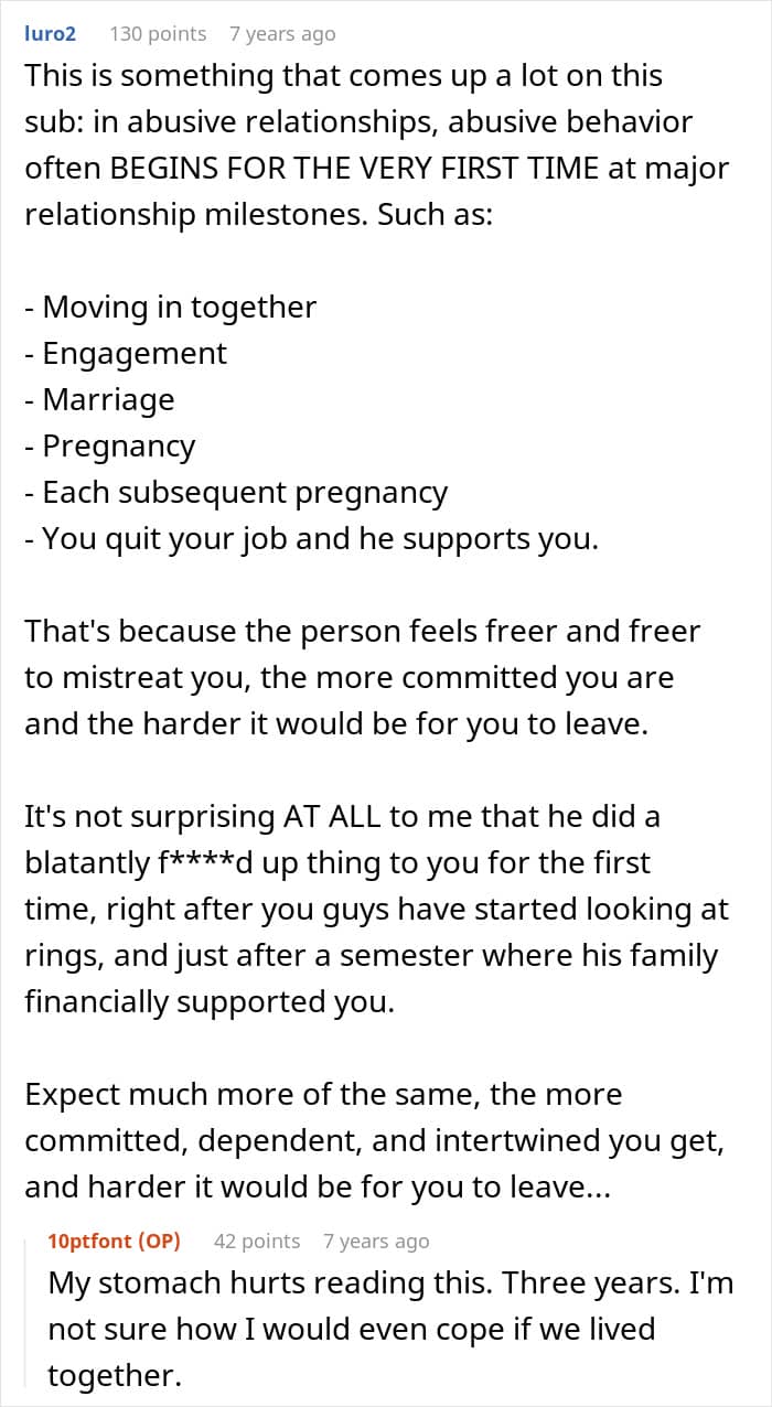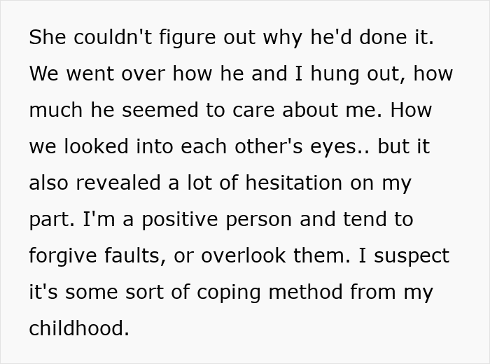 She felt heartbroken, because their relationship wasn’t a casual one. She and her boyfriend had spent nearly every night together, shared responsibilities, and even looked at engagement rings recently. His family had paid for her college semester, and her family had taken him on vacation. By all accounts, they were serious. But this incident had shaken everything up.