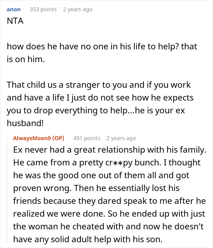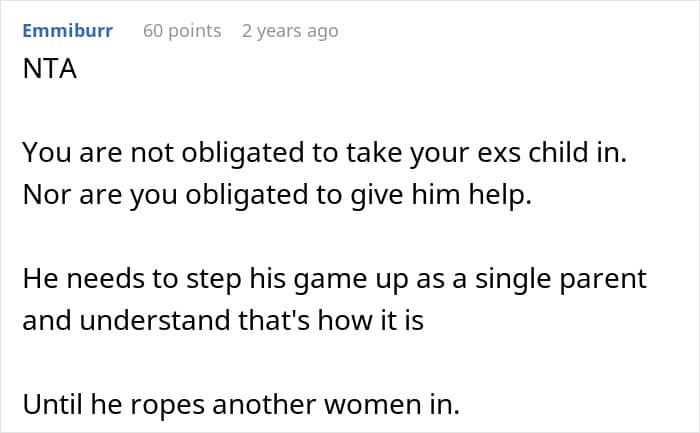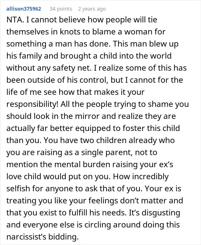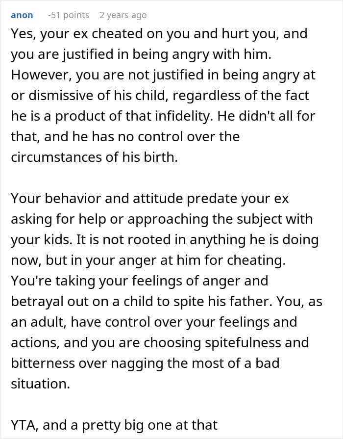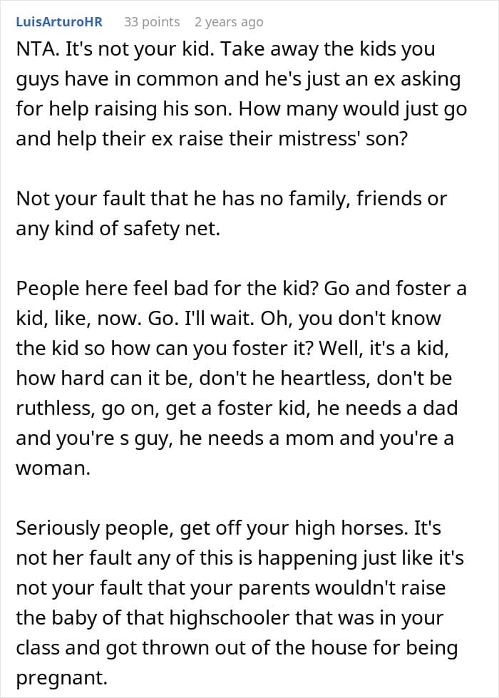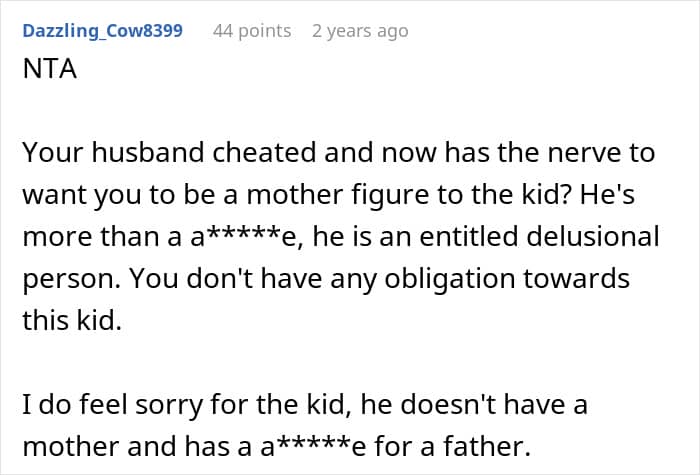 A woman had been cheated on by her husband, and she has since kept her distance. The man was suddenly in dire straits and asked her to take care of his love child, which she flat-out refused.
