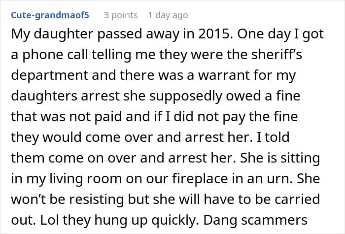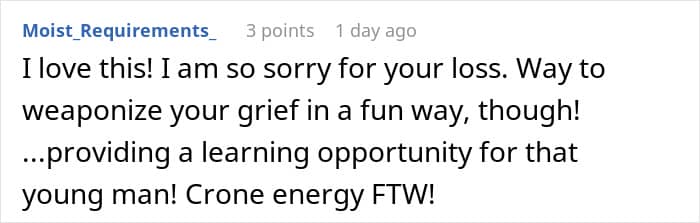 “It was her assertiveness that really stood out to me,” she said. “She was being pressured by a salesman who was intrusive, sexist, and quite rude. She stood up to him by bringing out her husband’s ashes, which shone a light on the inappropriateness of his behavior.”