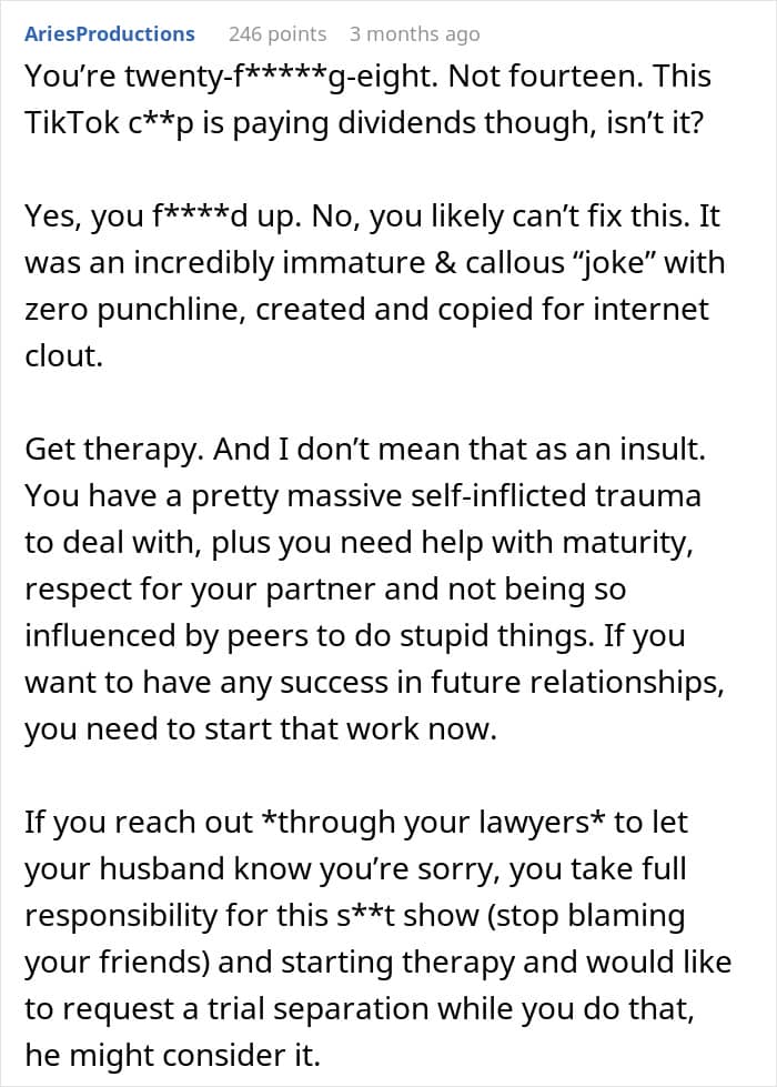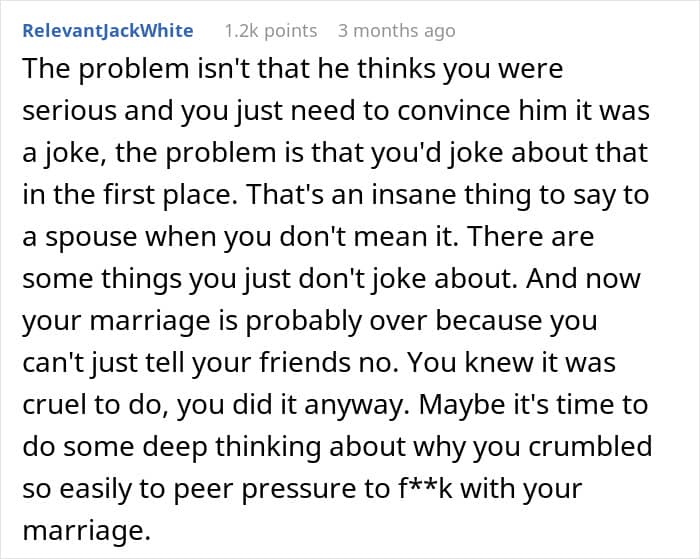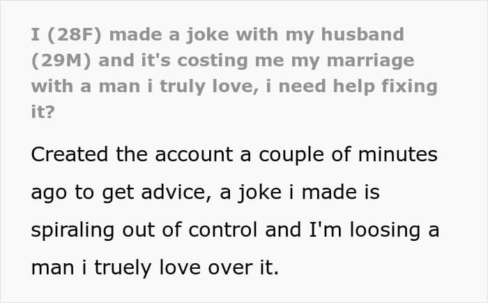 These reasons–among other things–are likely why the husband took the joke as harshly as he did. As the author mentioned, they’d been happily married for four years before the incident, and her statements may have hit him hard.