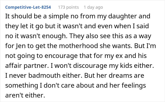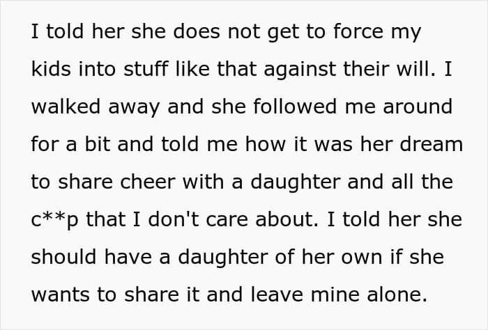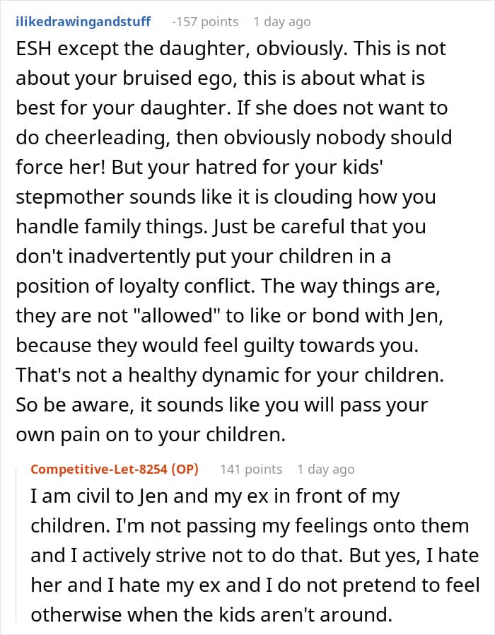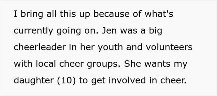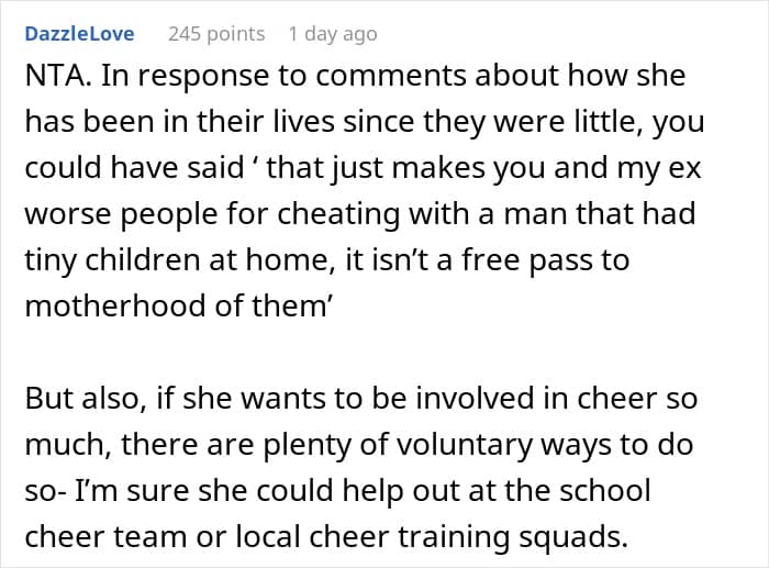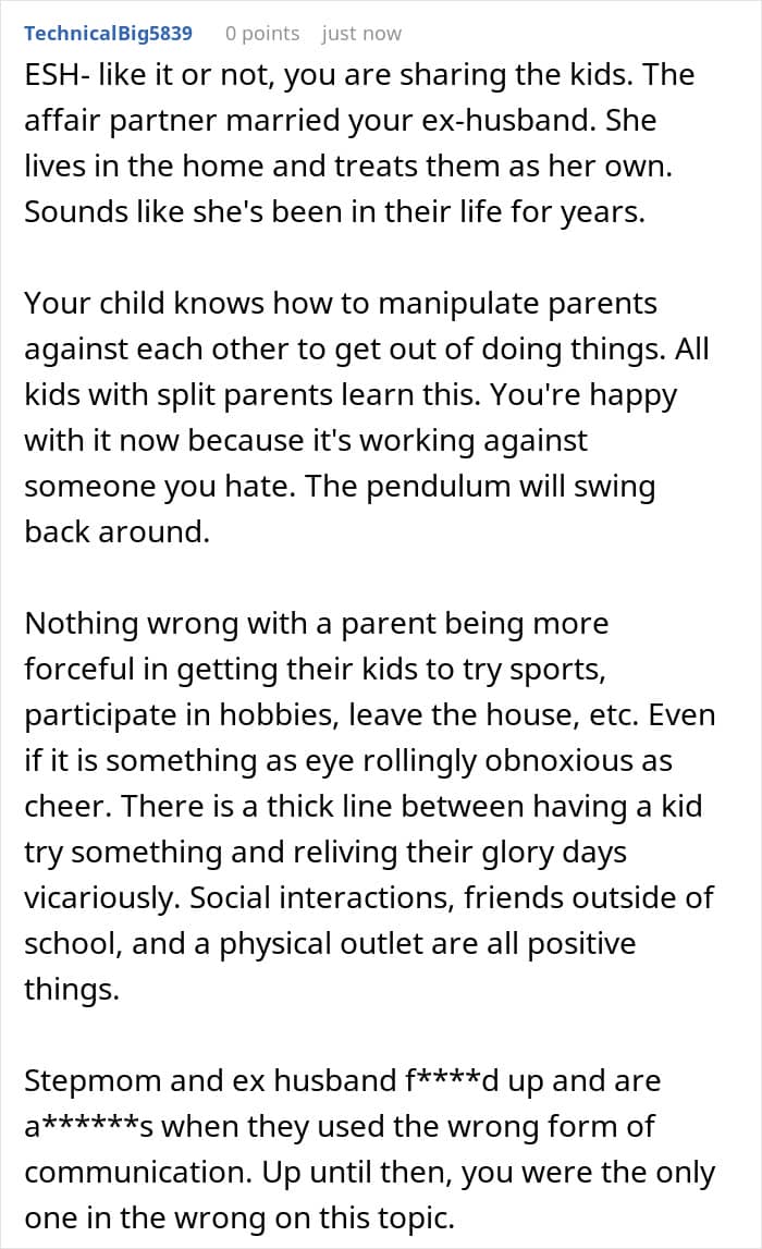 But this redditor made sure that her children knew that they didn’t have to take part in an activity that they were not interested in. In her daughter’s case, it was cheerleading—something that the girl’s dad’s new partner—his affair partner, as the OP calls her—really wanted her to take part in. Unsurprisingly, the woman pressuring the girl into cheerleading became a problem and even led to the OP wondering if she was a jerk for how she handled the dispute.
