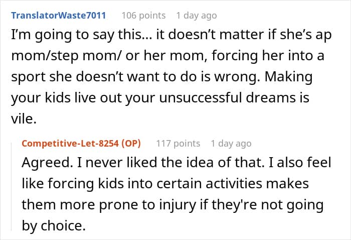In the OP’s daughter’s case, it was cheerleading that her dad’s partner pressured her to take upon. But despite its popularity—according to last year’s data, over 3.8 million Americans aged six and older participated in cheerleading—the activity didn’t appeal to the OP’s daughter the slightest bit.