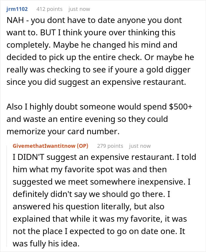 The woman understood the man’s behavior to be a “s**t test” attempting to check if she would pony up to a $250+ each restaurant bill. However, when she shared her story with a friend, her friend focused mostly on the cost of the dinner rather than anything else and told her she was the villain here.