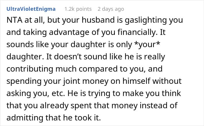 Folks also said that he seems to feel entitled to her and even their daughter’s money, which is not at all acceptable. They expressed that she has been doing way too much in this relationship and no partner should feel entitled over the other. And this is not at all a marriage of equality.