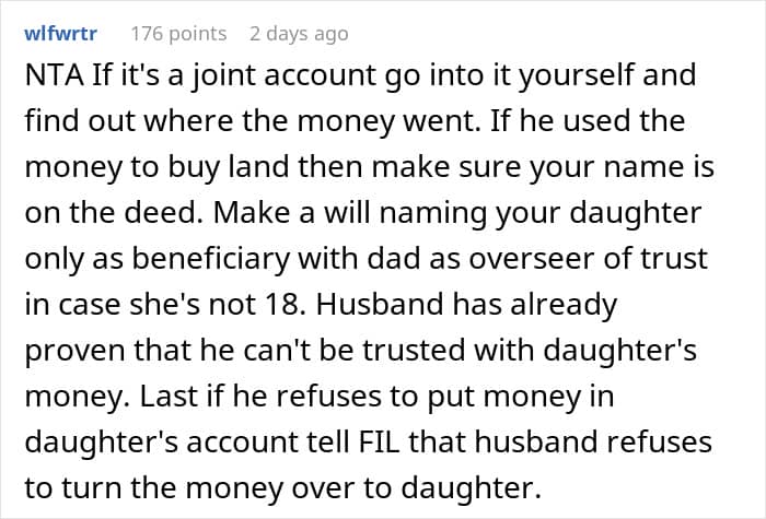 Well, now we know what they were worried about! They even advised OP to talk to her father-in-law and tell him how his son used the money. What do you make of that? We would love to hear your thoughts, so drop them in the comments below!