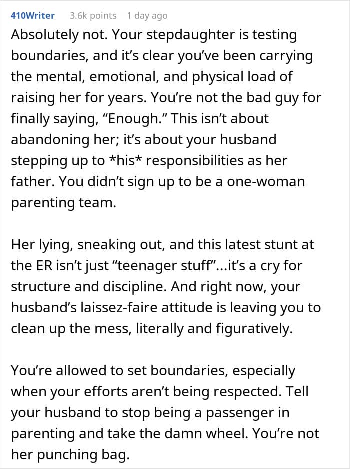 Well, the doctor suggested going to the ER, but once there, OP realized that the teen had just been exaggerating things, and boy was she mad! She was almost close to tears with anger and told her husband that the girl was his responsibility now, but he felt that she was just overwhelmed and overreacting. When OP vented online, folks disagreed with her husband.