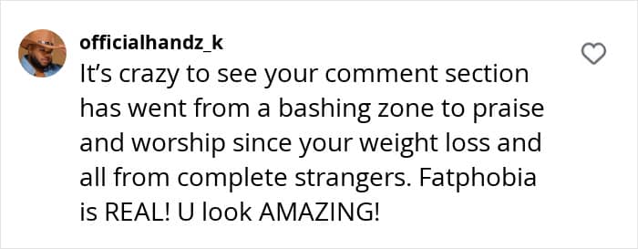 One user commented, “It’s crazy to see your comment section has [gone] from a bashing zone to praise and worship since your weight loss and all from complete strangers. Fatphobia is real! [You] look amazing!” While another added, “Isn’t it so crazy how many people come out of the woodworks when you lose weight? Very telling.”
