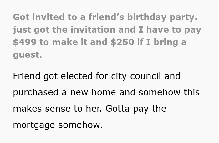 So, the Original Poster (OP) says that her friend recently got elected to the city council and bought a new home. And this decent lady is also celebrating her birthday – so she sent out invitations to numerous friends and acquaintances. But you have to pay $499 just to attend the party, and if you want to bring another guest, be so kind enough to fork out another $250.