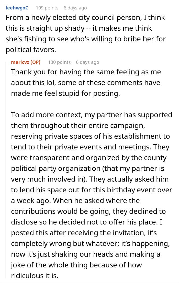 However, in the situation we described, the birthday girl is clearly doing well financially – after all, she just bought a new house! And the commenters, completely sharing the author’s opinion, are only surprised by how entitled her friend actually is. “From a newly elected city council person, I think this is straight up shady,” some of the responders wrote. By the way, the OP completely agreed with this point of view.