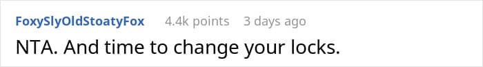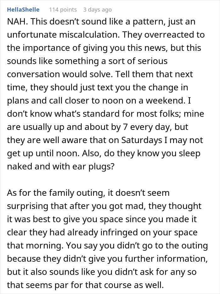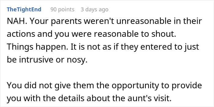 Still sleepy, she shouted, “Get out! I’m naked, what is wrong with you? Get out!” Dad, probably taken aback by the shouting, left. The OP then tried calling her mom, who didn’t pick up. Instead, a text came through, apologizing for the scare but justifying their invasion because they were worried after not getting a response at 9 a.m. on a Sunday. They even knocked on the door and windows before letting themselves in.