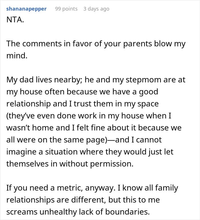Would you give your parents a key to your house? While living just a stone’s throw away from your parents comes with some perks, it also brings along unexpected surprises. On one hand, there’s the convenience of being near loved ones for quick visits, spontaneous family gatherings, and the reassurance that help is close by if needed. But being so close to your parents can lead to some unexpected visits, just like the one our OP (original poster) woke up to on a Sunday morning.