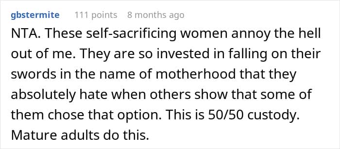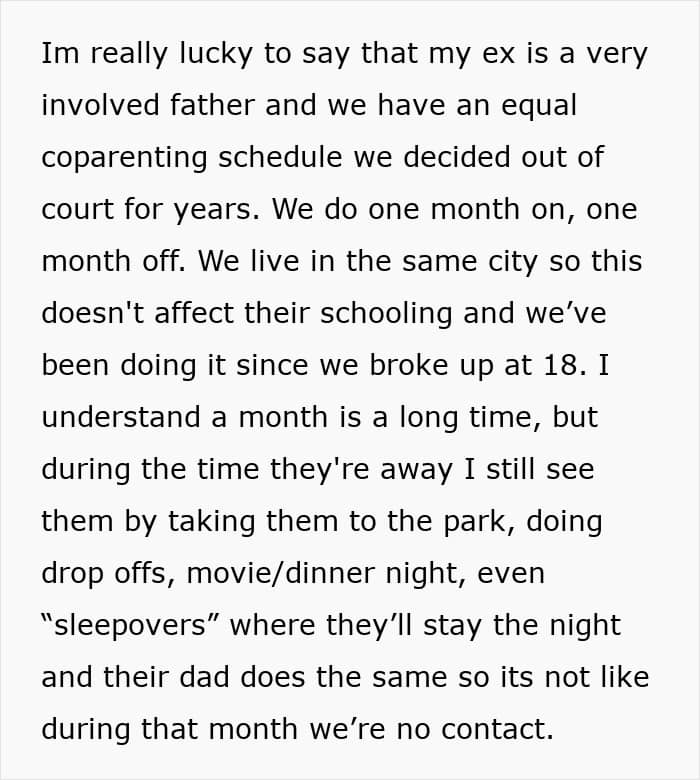 The OP (original poster) has a pretty sweet setup with her ex – a one-month-on, one-month-off parenting schedule. I have to admit, I haven’t heard of that one before, but apparently, it works well. During her “off” month, the OP still stays connected with her kids through FaceTime, sleepovers, and outings. If co-parenting was a sport, she’d probably have a trophy.