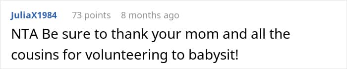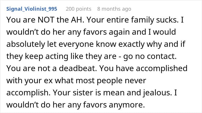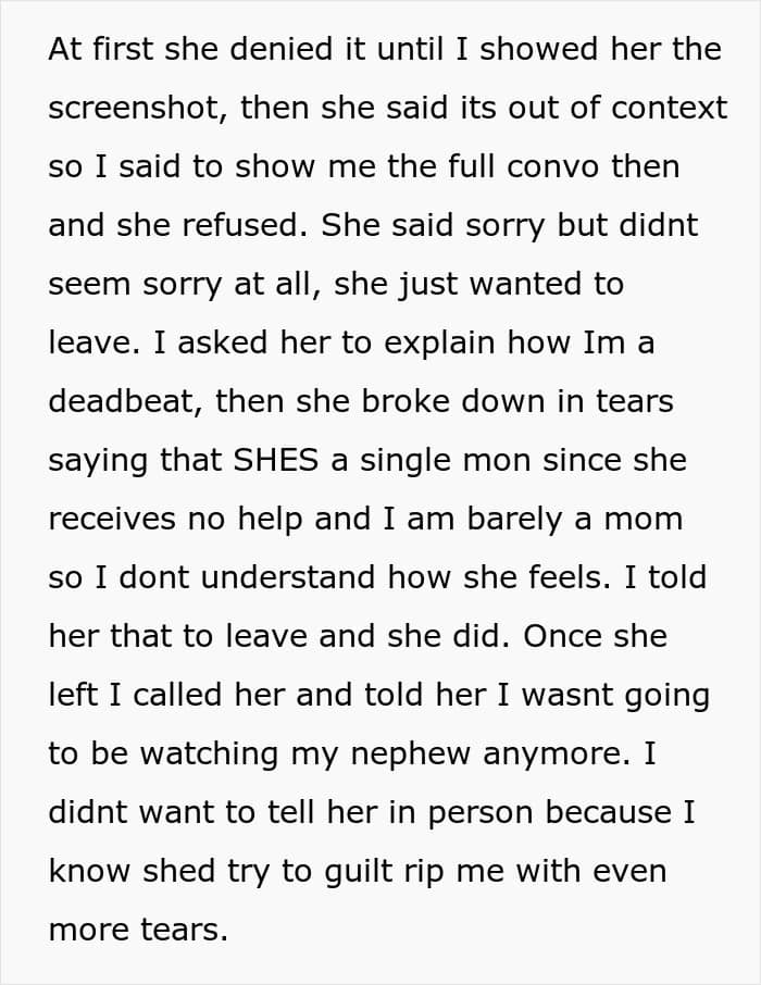 Turns out, losing her babysitter meant potentially losing her new job. Of course, the family group chat started lighting up, and everyone was calling the OP the bad guy. But is she, though? Calling someone a deadbeat mom because they figured out a parenting system that works for them? That’s like shaming someone for being on vacation while you’re stuck at work. Jealousy can make people say some wild stuff, can’t it?