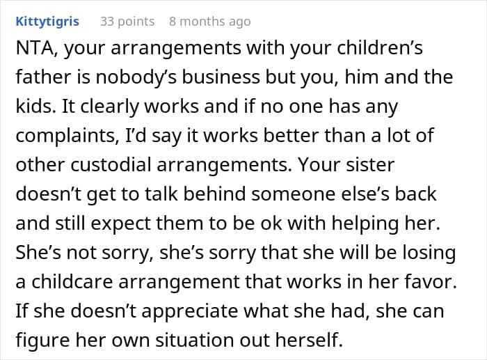 It’s easy to understand why the OP’s sister felt some type of way—being a single mom is tough, and watching someone else live their best life can sting. But here’s the thing: jealousy doesn’t give you a free pass to treat people badly. Instead of tearing others down, wouldn’t it be better to focus on improving your own situation? Seriously, why do moms get judged for every single thing?