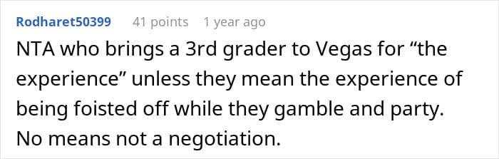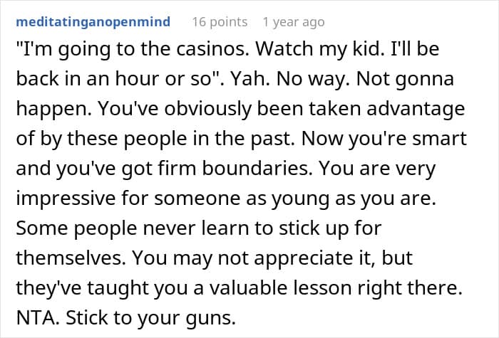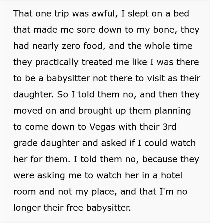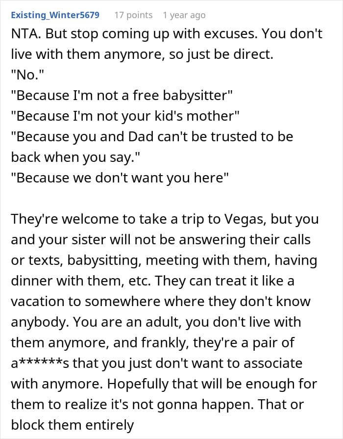 Sometimes, they might ask family members to babysit, but it can be difficult to convince them. This teen, for example, refused to babysit her 3rd-grade sister while her parents visited Las Vegas and shared her story online. Although many people agreed that she’s free to say ‘no,’ her reasoning was confusing to most.