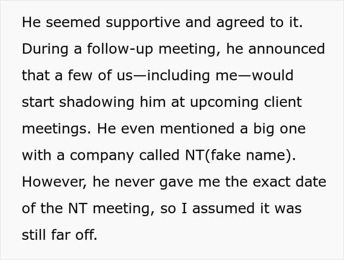 They revealed that everyone was called into a meeting after missing the bootcamp. “He chewed us all out and his ‘pets’ (the other guys who shadowed him in the NT meeting) put up a tear-filled show about how they felt awful about missing that bootcamp and deeply regretted it,” explained the employee.