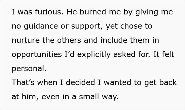 One tech employee recently shared how they’d asked their boss for mentorship so they could gain new skills and grow within the company. Instead of supporting this employee, the boss threw them in the deep end and watched them sink. He then seemingly nurtured other colleagues in a blatant act of favoritism. When the employee sought revenge, it became very apparent that the boss was nobody’s favorite. We reached out to the employee to find out more.
