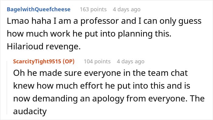 “I thought it was not really something a lot of people would understand, but seeing some of the comments being supportive and suggesting responses to my boss’s freak-outs was funny to read and made my day,” they said. “Although seeing some comments taking my boss’s side or straight up calling me incompetent because of one botched meeting dampened my schadenfreude.”