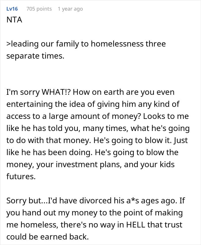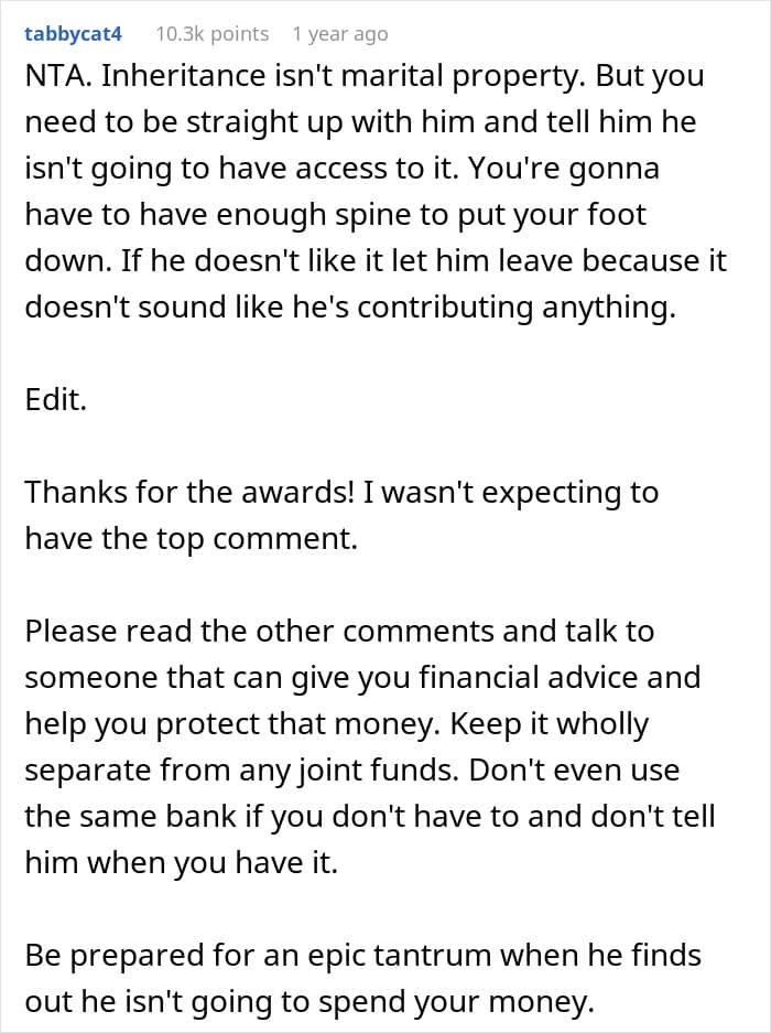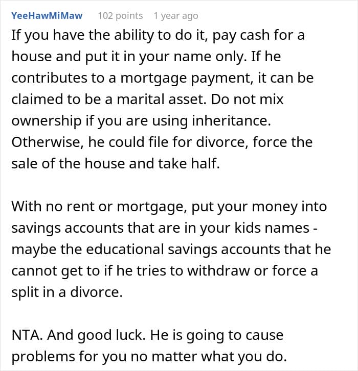 A woman, for instance, shared online how she was planning to use nearly half of her inheritance money to secure her children’s future. However, while she wanted to save the funds for things like graduations and college trips, her husband wanted to use it to buy things for himself. This, along with his other financially irresponsible actions, led the author to consider divorce. Keep reading for the complete story.