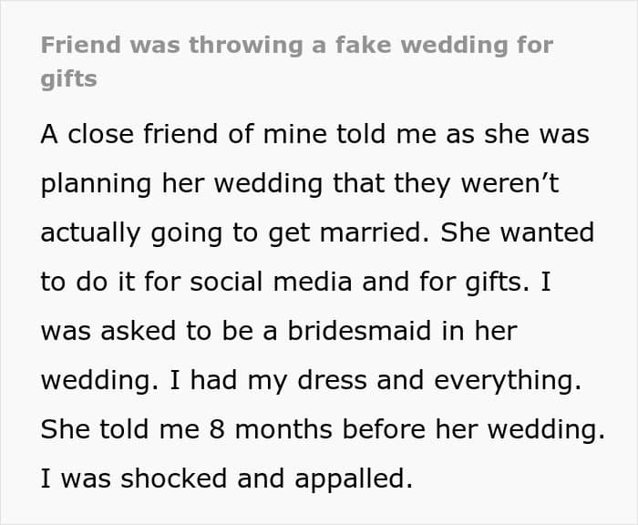 When a friend tells you they’re having a wedding, your first thought probably isn’t “Is it for money and social media likes?” u/sly-pickle felt the same: she cut ties with the friend right after she told her about her plans for the fake wedding.