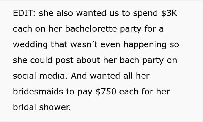 She wasn’t as close to the bride’s family or her fiancé, either. That’s why she didn’t feel comfortable telling others about the real wedding intentions. “Because I never made it to her bachelorette party or bridal shower I never met them,” u/sly-pickle clarifies. “She didn’t have that many friends in the area either and those that she did have she kept separate from me.”