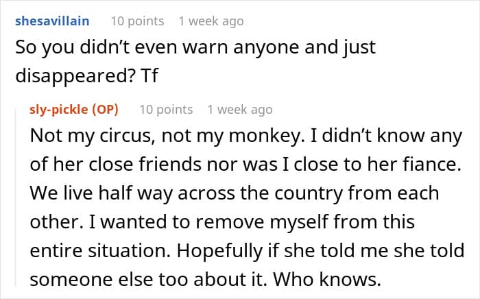 “I wasn’t even close to her fiancé and I figured if she told me this she had to have told someone else. I just wanted to get as far away from her and this situation,” u/sly-pickle recalls.