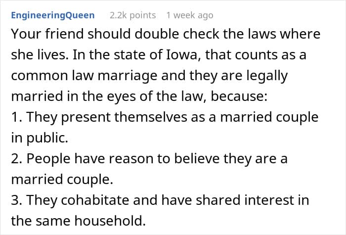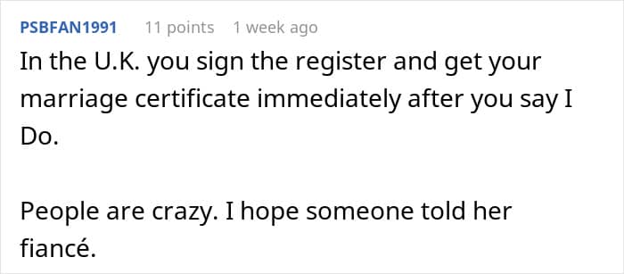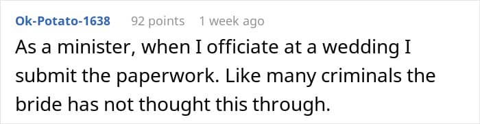 “I also didn’t feel it was my place to go around and tell her friends and family and fiancé,” the Redditor explains. Some commenters blamed her for not telling others or at least the BF about the bride’s real plans, but the thought didn’t really cross her mind then.