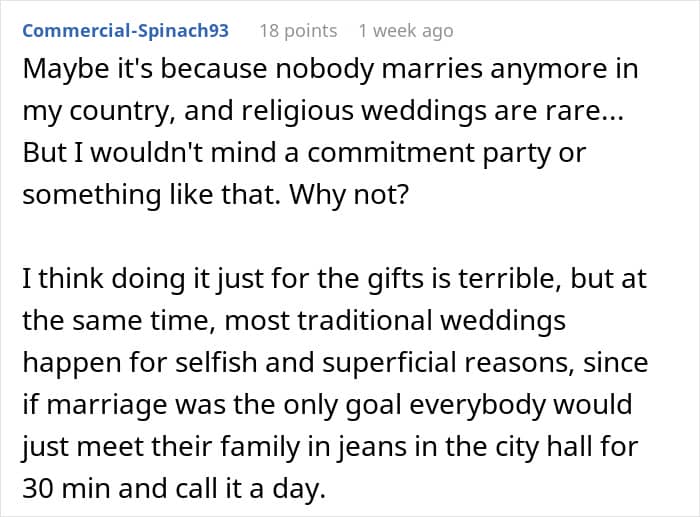 Yet sometimes, couples get married for other reasons. This netizen’s friend decided a wedding might be quite a lucrative endeavor, so, she wanted to throw a wedding for the attention and the gifts. After she found this out, the woman refused to attend the wedding but still shamed her friend online to demonstrate what some folks are willing to do for free stuff.