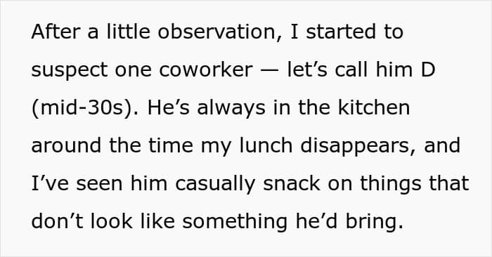 She also suggests considering the dynamic between the author and the lunch thief. The OP is a young woman and the lunch thief is a male, although of unknown age. If the two have a contentious relationship, something else might be at play.