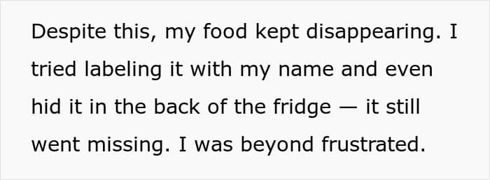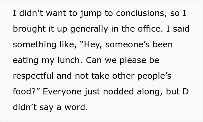 The bigger issue here might be that the OP’s coworkers don’t think food theft is a big deal. “Is it okay in that team to claim credit for other people’s ideas? Do they take supplies that belong to other people or the company? You’d hope that you don’t have to remind adults not to steal but it appears that the norms of this team (and perhaps the organization?) are hazy on this issue,” Carnachan observes.