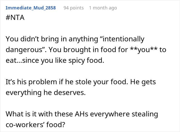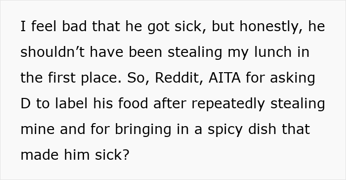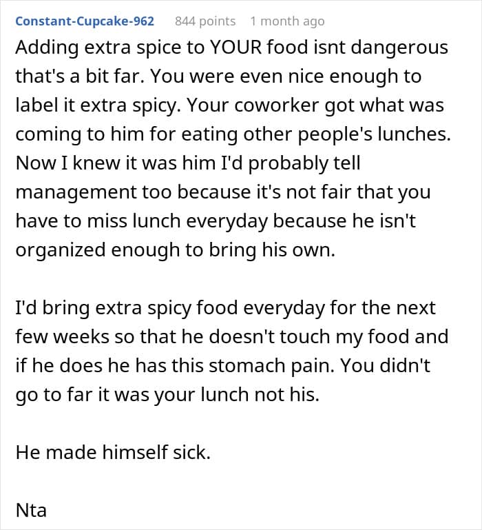 When one netizen was confronted with one such lunch thief, they decided to spice things up. Literally. To out the office glutton, they added some extra spice to their lunch and even labeled it “very spicy.” When the thief got an upset stomach, colleagues reprimanded the netizen. So, they asked the Internet: whose fault was it really?