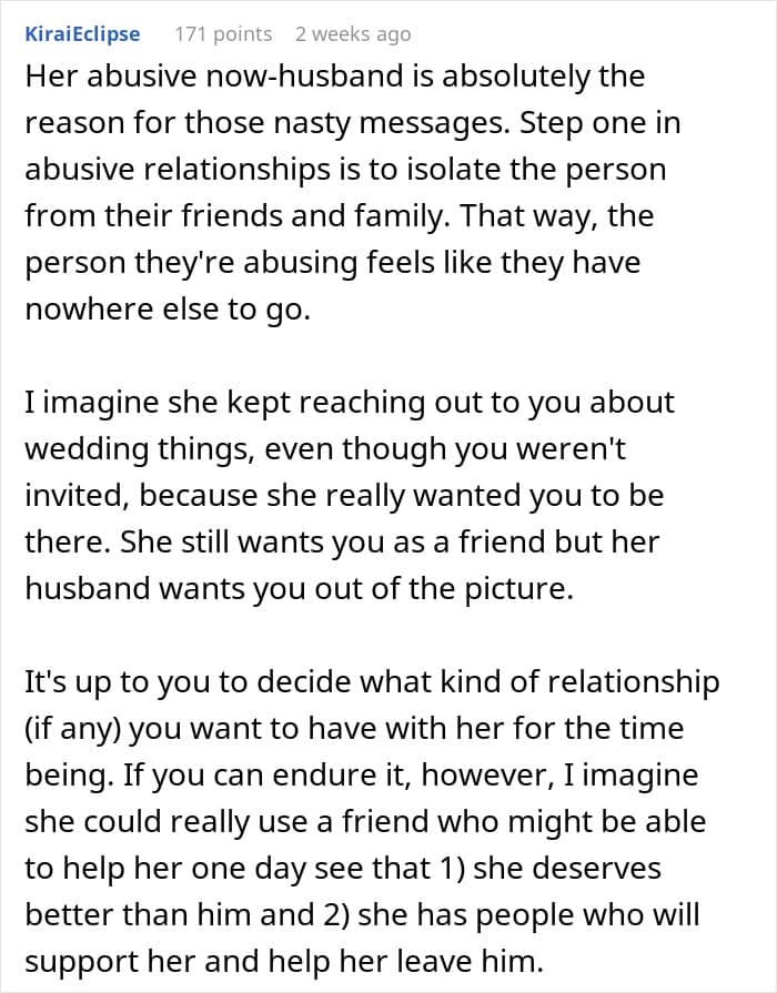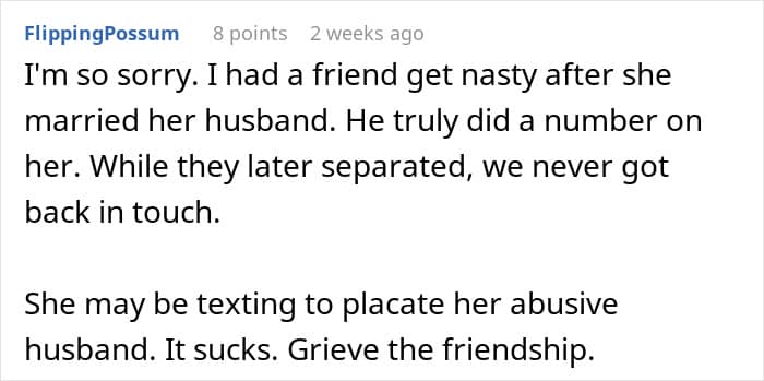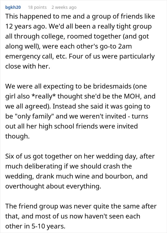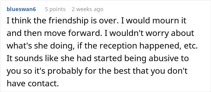 One woman shared how she was shunned by someone who once called her their best friend. The woman assumed she’d be a bridesmaid since the pair were quite tight. But instead of asking her to do the honors, the bride called her bestie to tell her she wasn’t invited to the wedding. As if that wasn’t enough, she texted her friend photos of the big day, rubbing a big handful of salt in the wound. The woman now feels it’s time to end the friendship.