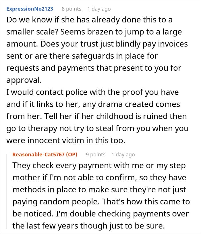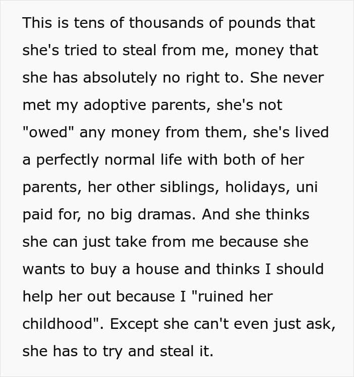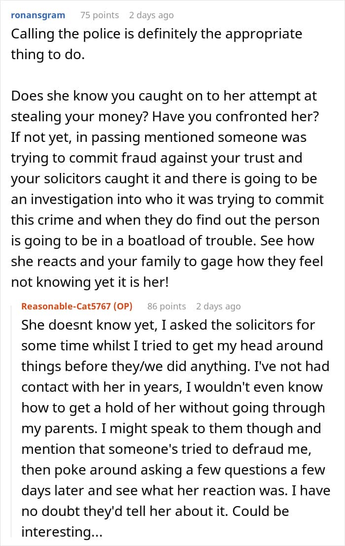 A troubled relationship had kept this Redditor and her sister apart for nearly ten years. But tensions flared recently, going from bad to worse when she found out her sibling had tried to take tens of thousands of pounds from her mental health trust fund. A shocking display of audacity, to say the least. Now, she’s grappling with the fallout and deciding what steps to take next.