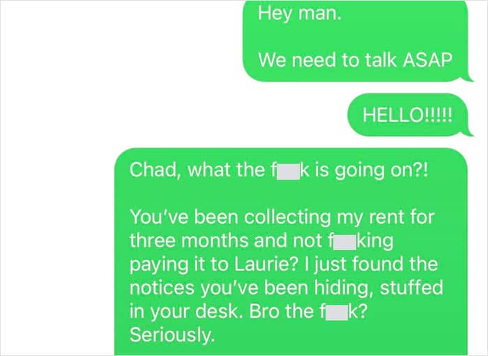 A man asked the internet what to do when he discovered that his roommate simply stole the last three months of rent and ran away. He shared screenshots of the downright bizarre and infuriating “excuses” his roommate provided while readers shared their thoughts and suggestions in the comments.