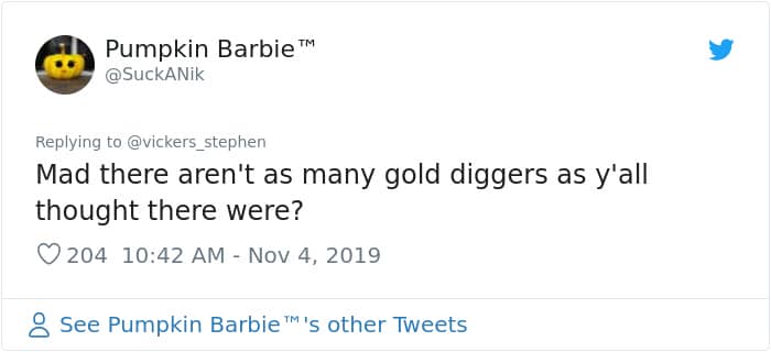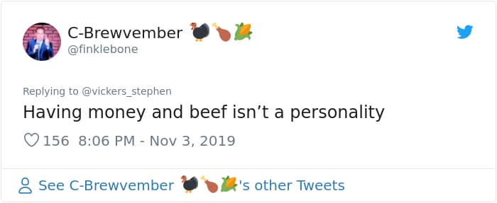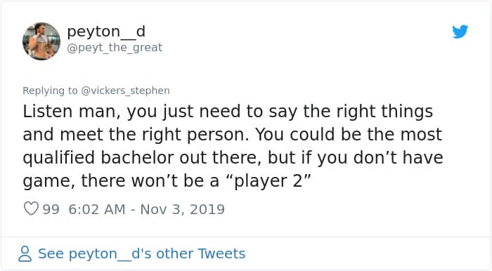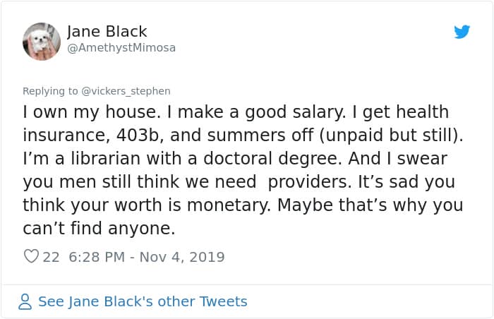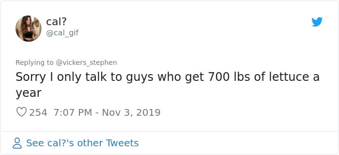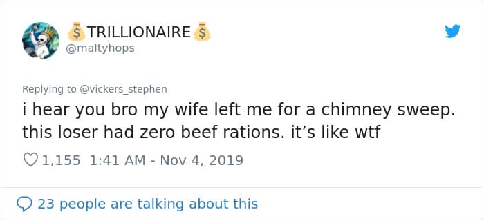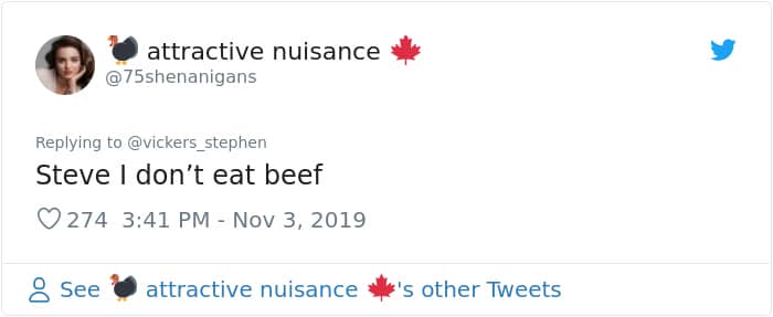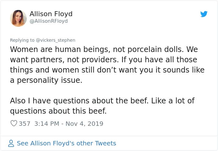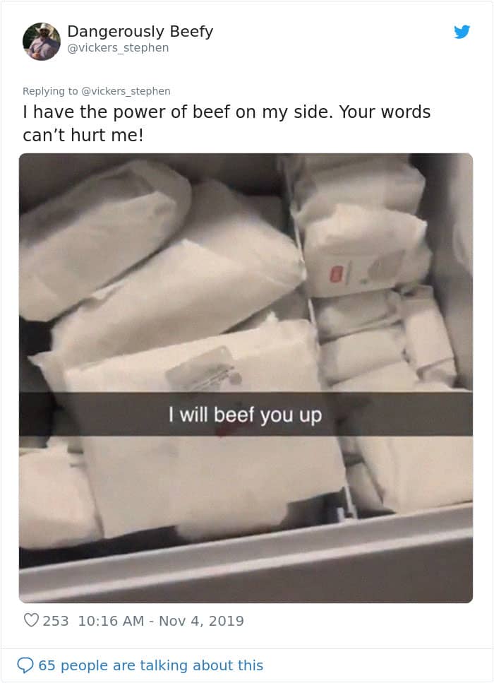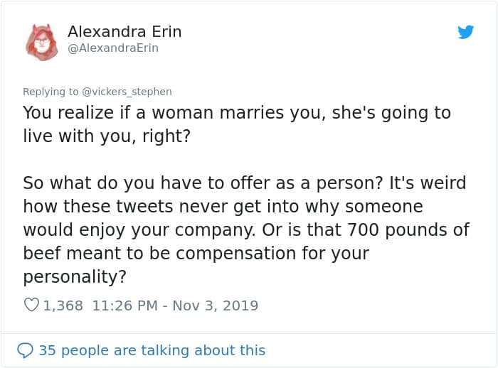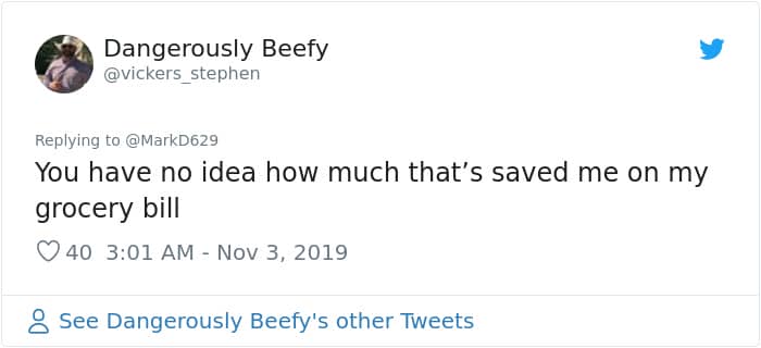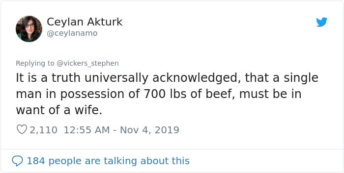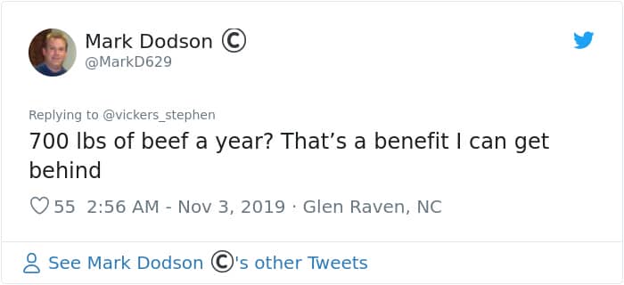 Sadly for the likes of Twitter user Stephen Vickers, the modern woman just doesn’t value basic qualities like physical protection and being ‘provided for’ the way that she used to– not even 700lbs of beef annually can replace a decent personality these days. What is the world coming to?